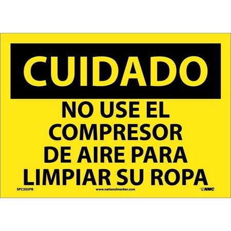 NMC SPC205RB OSHA Sign, Legend "CUIDADO - NO USE EL COMPRESOR DE AIRE PARA LIMPIAR SU ROPA", 14" Length x 10" Height, Rigid Plastic, Black on Yellow