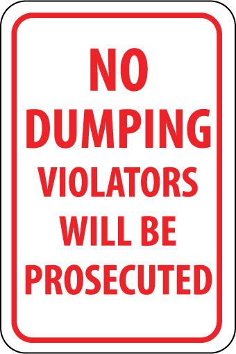 - Specifications: the rectangular aluminum no dumping sign is 0.063 in. thick, 12 in. wide and 18 in. high. The sign is graffiti proof, UV and chemical resistant. It has red text on white base