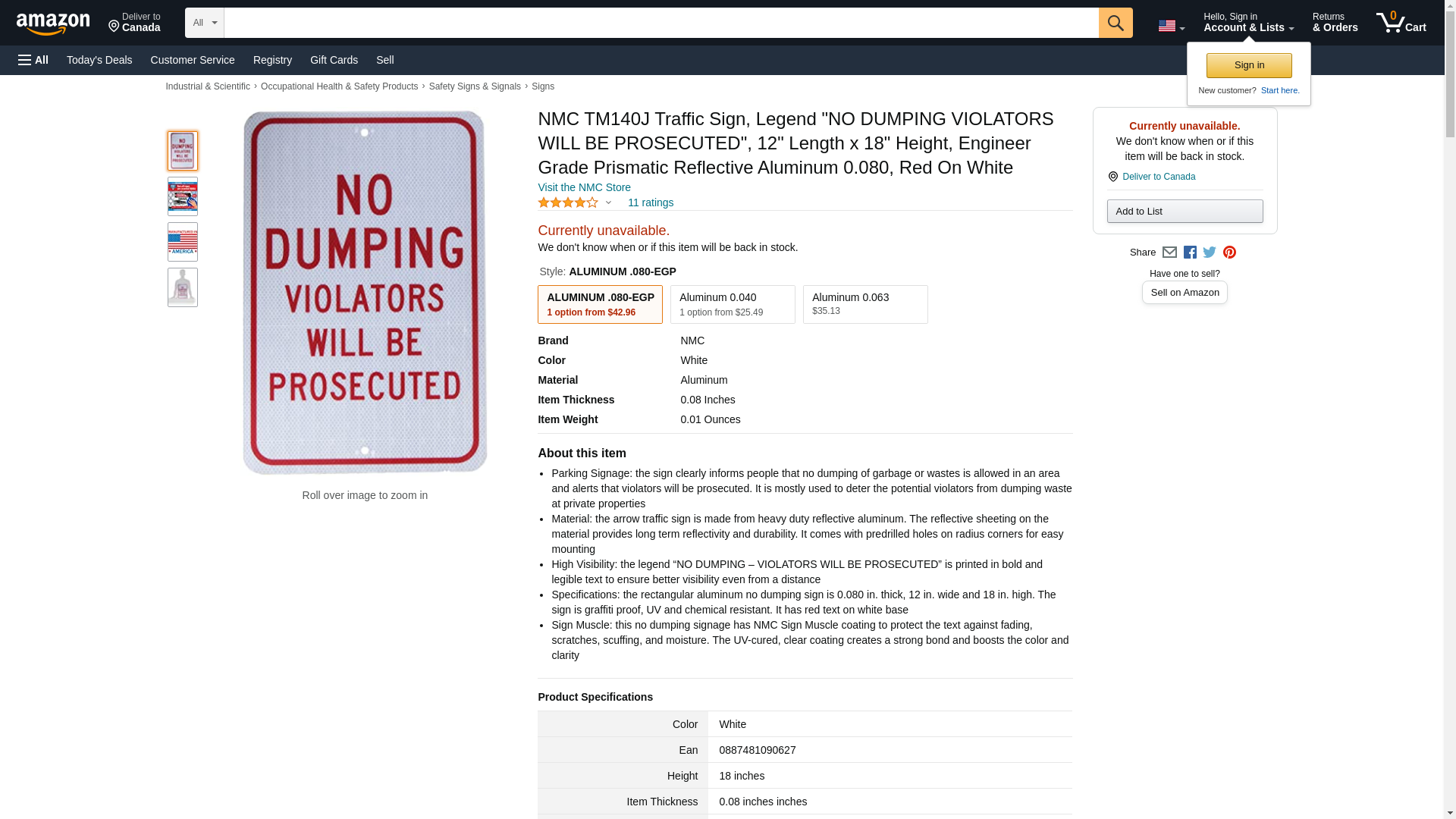 - Specifications: the rectangular aluminum no dumping sign is 0.080 in. thick, 12 in. wide and 18 in. high. The sign is graffiti proof, UV and chemical resistant. It has red text on white base