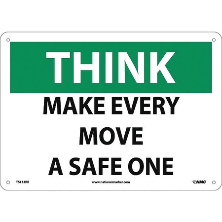 NMC TS133RB OSHA Sign, Legend "THINK - MAKE EVERY MOVE A SAFE ONE", 14" Length x 10" Height, Rigid Plastic, Black on White