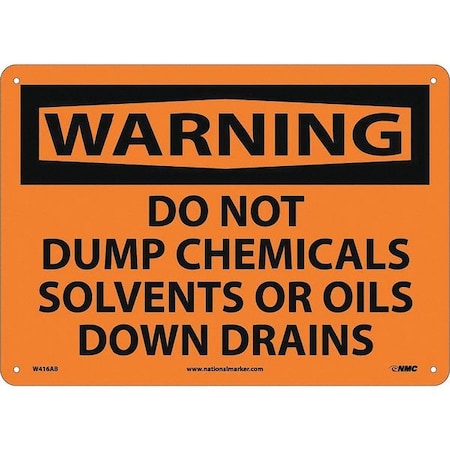 NMC W416AB OSHA Sign, Legend "WARNING - DO NOT DUMP CHEMICALS, SOLVENTS OR OILS DOWN DRAINS", 14" Length x 10" Height, Aluminum, Black on Orange