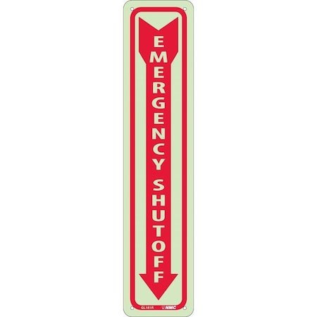 NMC GL181P Fire Sign, Legend "EMERGENCY SHUT OFF" with Down Arrow Graphic, 4" Length x 18" Height, Glow Polyester, Red on Yellow
