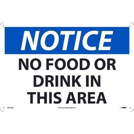 NMC N310RB NOTICE - NO FOOD OR DRINK BEYOND THIS POINT Notice Sign - 14in.x 10in., Black/Blue on White, OSHA Signage with Pre-Drilled Holes, 10x14 inches