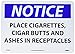 | Feature | Header "NOTICE" and Legend "PLACE CIGARETTES, CIGAR BUTTS AND ASHES IN RECEPTACLES" |