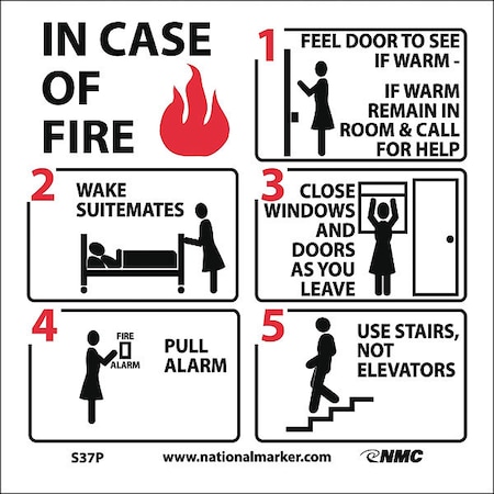 NMC S37P Hotel Motel Fire Emergency Instructions Graphic See Sign, Legend "IN CASE OF FIRE", 7" Length x 7" Height, Pressure Sensitive Vinyl, Black/Red on White