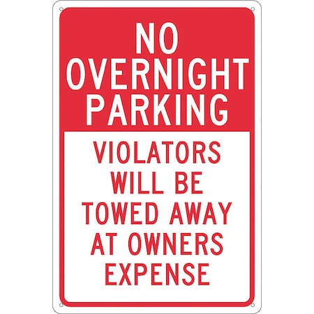 NMC TM57G Traffic Sign, Legend "NO OVERNIGHT PARKING VIOLATORS WILL BE TOWED AWAY AT OWNER'S EXPENSE", 12" Length x 18" Height, 0.040 Aluminum, Red On White