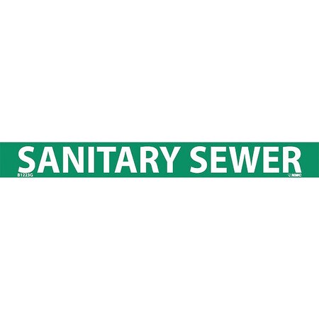 NMC B1223G Pipemarkers Sign, Legend "Sanitary Sewer", 9" Length x 1" Height, 3/4" Letter Size, Pressure Sensitive Vinyl, White on Green (Pack of 25)