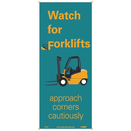 NMC BT52 Motivational and Safety Banner, Legend "Watch for Forklifts approach corners cautiously" with Graphic, 26" Length x 60" Height, Vinyl, Orange on