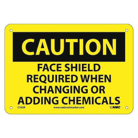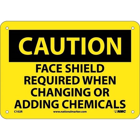 NMC C102R OSHA Sign, Legend "CAUTION - FACE SHIELD REQUIRED WHEN CHANGING OR ADDING CHEMICALS", 10" Length x 7" Height, Rigid Plastic, Black on Yellow