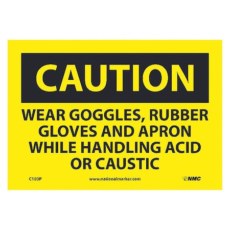 NMC C103P OSHA Sign, Legend "CAUTION - WEAR GOGGLES RUBBER GLOVES AND APRON WHILE HANDLING ACID OR CAUSTIC", 10" Length x 7" Height, Pressure Sensitive Vinyl, Black on Yellow