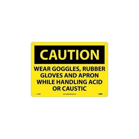 NMC C103R OSHA Sign, Legend "CAUTION - WEAR GOGGLES RUBBER GLOVES AND APRON WHILE HANDLING ACID OR CAUSTIC", 10" Length x 7" Height, Rigid Plastic, Black on Yellow