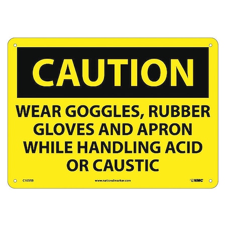 NMC C103RB OSHA Sign, Legend "CAUTION - WEAR GOGGLES RUBBER GLOVES AND APRON WHILE HANDLING ACID OR CAUSTIC", 14" Length x 10" Height, Rigid Plastic, Black on Yellow