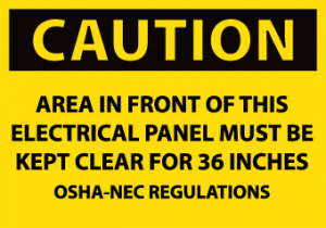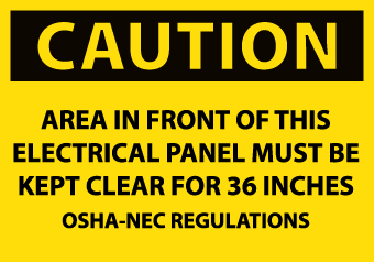- Header "CAUTION" and legend "AREA IN FRONT OF THIS ELECTRICAL PANEL MUST BE KEPT CLEAR FOR 36 INCHES OSHA-NEC..."
