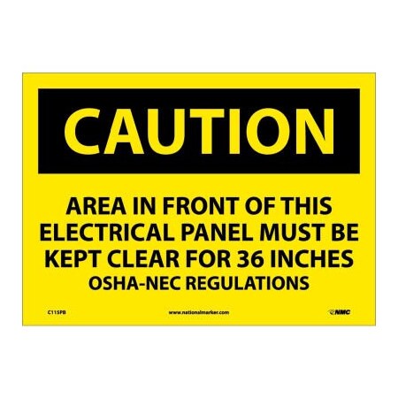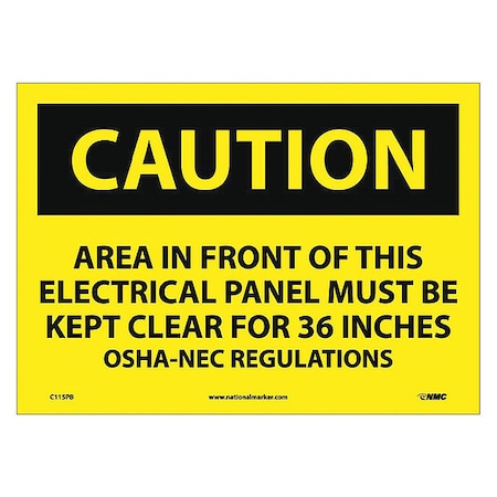NMC C115PB OSHA Sign, Legend "CAUTION - AREA IN FRONT OF THIS ELECTRICAL PANEL MUST BE KEPT CLEAR FOR 36 INCHES OSHA-NEC REGULATIONS", 14" Length x 10" Height, Pressure Sensitive Vinyl, Black on Yellow