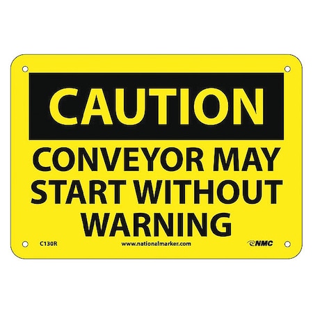NMC C130R OSHA Sign, Legend "CAUTION - CONVEYOR MAY START WITHOUT WARNING", 10" Length x 7" Height, Rigid Plastic, Black on Yellow