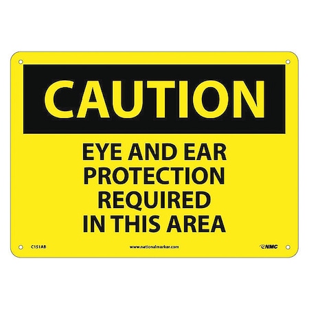 NMC C151AB OSHA Sign, Legend "CAUTION - EYE AND EAR PROTECTION REQUIRED IN THIS AREA", 14" Length x 10" Height, Aluminum, Black on Yellow