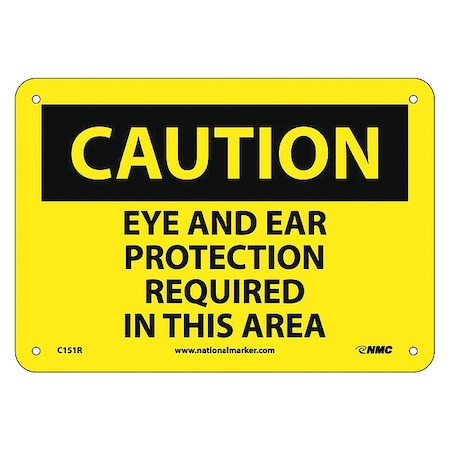 NMC C151R OSHA Sign, Legend "CAUTION - EYE AND EAR PROTECTION REQUIRED IN THIS AREA", 10" Length x 7" Height, Rigid Plastic, Black on Yellow