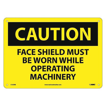 NMC C155RB OSHA Sign, Legend "CAUTION - FACE SHIELD MUST BE WORN WHILE OPERATING MACHINERY", 14" Length x 10" Height, Rigid Plastic, Black on Yellow