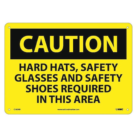 NMC C160AB OSHA Sign, Legend "CAUTION - HARD HATS SAFETY GLASSES AND SAFETY SHOES REQUIRED IN THIS AREA", 14" Length x 10" Height, Aluminum, Black on Yellow