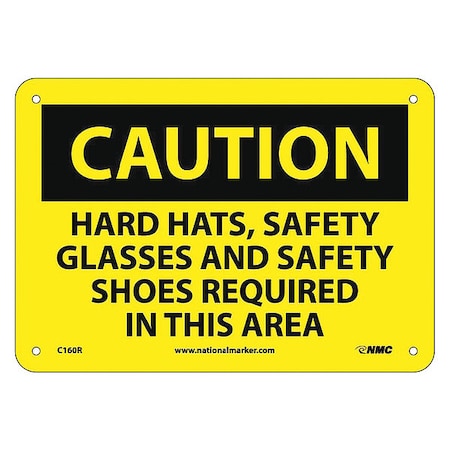 NMC C160R OSHA Sign, Legend "CAUTION - HARD HATS SAFETY GLASSES AND SAFETY SHOES REQUIRED IN THIS AREA", 10" Length x 7" Height, Rigid Plastic, Black on Yellow