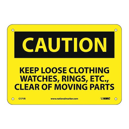 NMC C171R OSHA Sign, Legend "CAUTION - KEEP LOOSE CLOTHING WATCHES RINGS ETC., CLEAR OF MOVING PARTS", 10" Length x 7" Height, Rigid Plastic, Black on Yellow