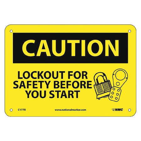 NMC C177R OSHA Sign, Legend "CAUTION - LOCKOUT FOR SAFETY BEFORE YOU START" with Graphic, 10" Length x 7" Height, Rigid Plastic, Black on Yellow