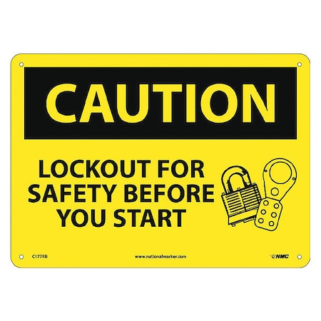 NMC C177RB OSHA Sign, Legend "CAUTION - LOCKOUT FOR SAFETY BEFORE YOU START" with Graphic, 14" Length x 10" Height, Rigid Plastic, Black on Yellow