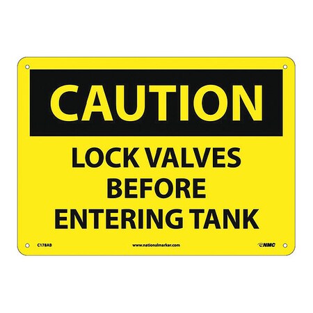 NMC C178AB OSHA Sign, Legend "CAUTION - LOCK VALVES BEFORE ENTERING TANKS", 14" Length x 10" Height, Aluminum, Black on Yellow