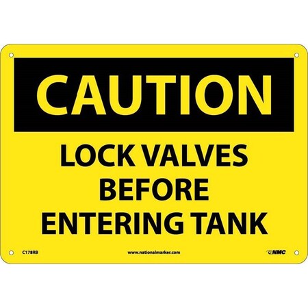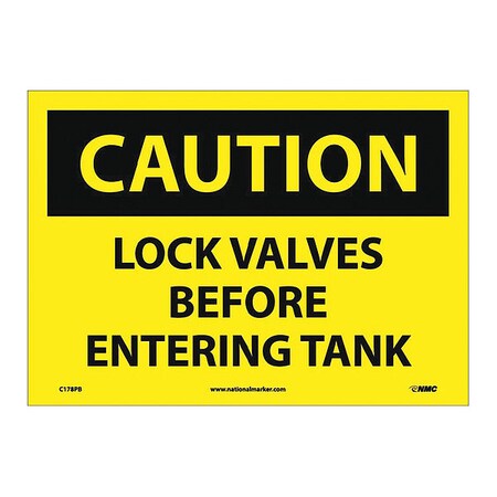 NMC C178PB OSHA Sign, Legend "CAUTION - LOCK VALVES BEFORE ENTERING TANKS", 14" Length x 10" Height, Pressure Sensitive Vinyl, Black on Yellow