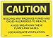 - Header "CAUTION" and legend "WELDING MAY PRODUCE FUMES AND GASES HAZARDOUS TO HEALTH. AVOID BREATHING THESE FUMES AND GASES. USE ADEQUATE VENTILATION