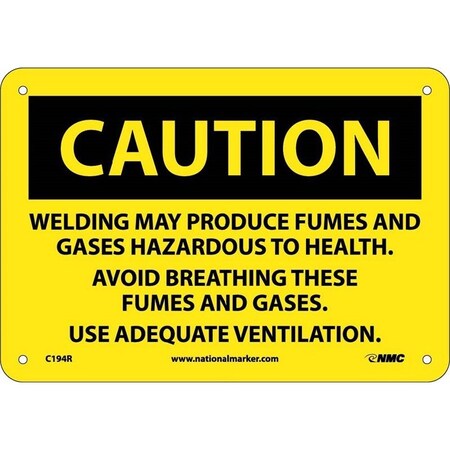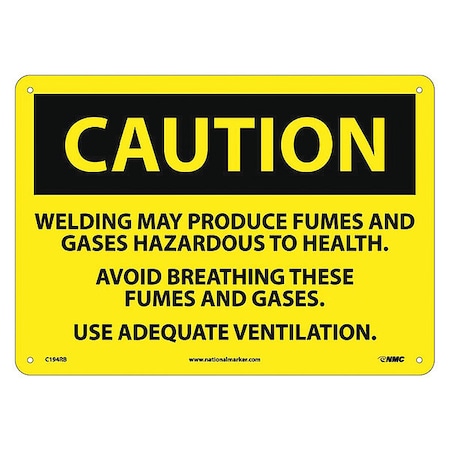 NMC C194RB OSHA Sign, Legend "CAUTION - WELDING MAY PRODUCE FUMES AND GASES HAZARDOUS TO HEALTH. AVOID BREATHING THESE FUMES AND GASES. USE ADEQUATE VENTILATION", 14" Length x 10" Height, Rigid Plastic, Black on Yellow