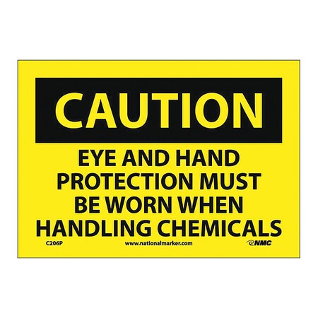 NMC C206P OSHA Sign, Legend "CAUTION - EYE AND HAND PROTECTION MUST BE WORN WHEN HANDLING CHEMICALS", 10" Length x 7" Height, Pressure Sensitive Vinyl, Black on Yellow