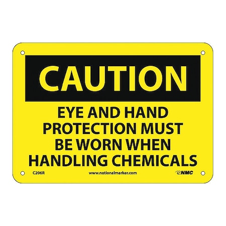 NMC C206R OSHA Sign, Legend "CAUTION - EYE AND HAND PROTECTION MUST BE WORN WHEN HANDING CHEMICALS", 10" Length x 7" Height, Rigid Plastic, Black on Yellow