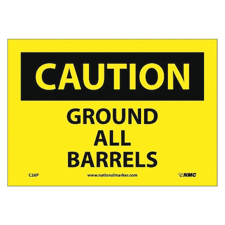 NMC C28P OSHA Sign, Legend "CAUTION - GROUND ALL BARRELS", 10" Length x 7" Height, Pressure Sensitive Vinyl, Black on Yellow