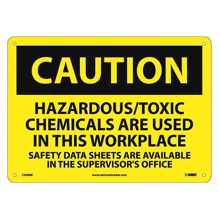 NMC C308AB OSHA Sign, Legend "CAUTION - HAZARDOUS/TOXIC CHEMICALS ARE USED IN THIS WORKPLACE SAFETY DATA SHEETS ARE AVAILABLE IN THE SUPERVISOR'S OFFICE", 14" Length x 10" Height, Aluminum, Black on Yellow