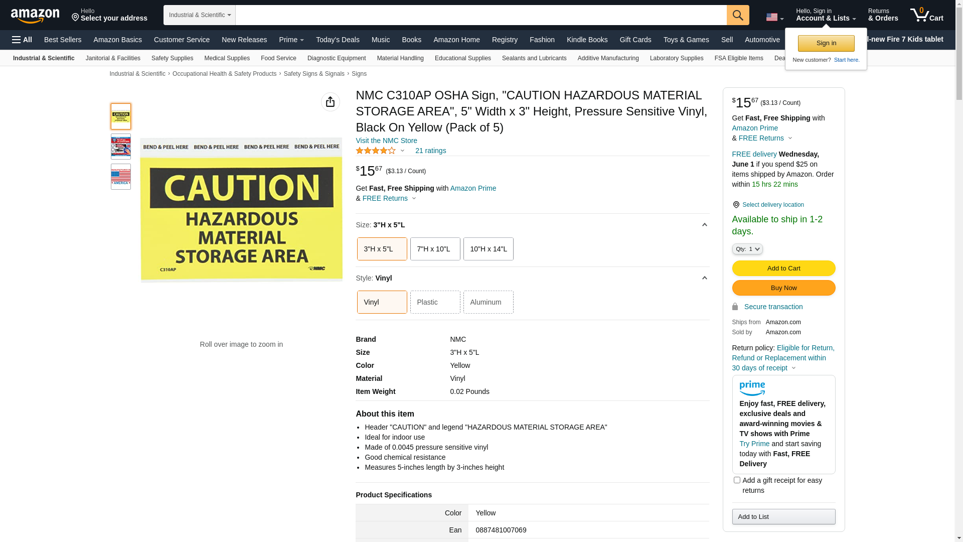Caution Hzous Material Storage Area,PK5, Package Quantity 5