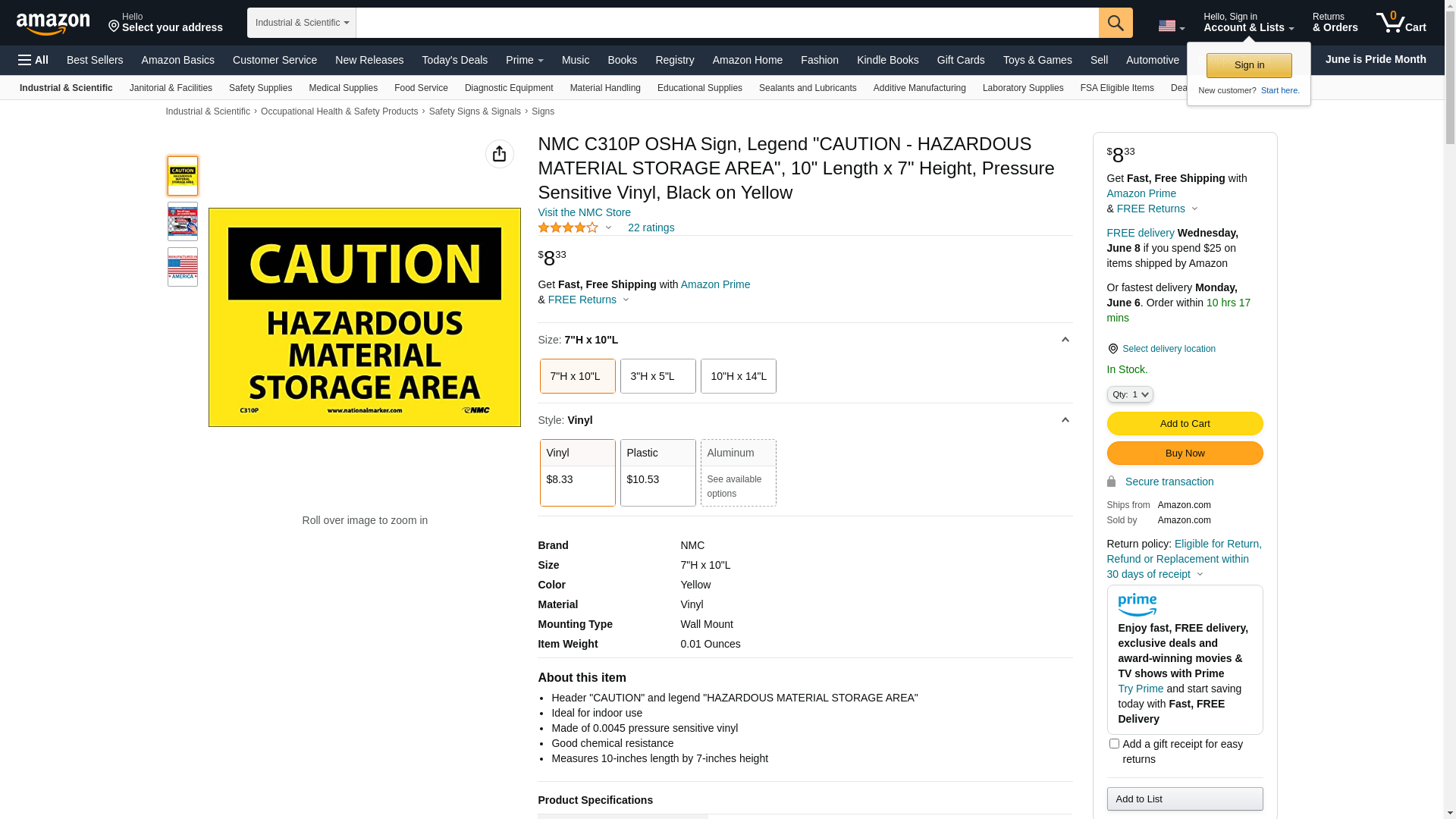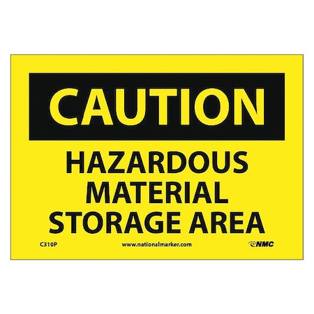 NMC C310P OSHA Sign, Legend "CAUTION - HAZARDOUS MATERIAL STORAGE AREA", 10" Length x 7" Height, Pressure Sensitive Vinyl, Black on Yellow