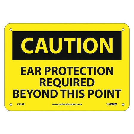 NMC C355R OSHA Sign, Legend "CAUTION - CAUTION EAR PROTECTION REQUIRED BEYOND THIS POINT", 10" Length x 7" Height, Rigid Plastic, Black on Yellow