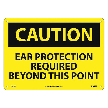 NMC C355RB OSHA Sign, Legend "CAUTION - EAR PROTECTION REQUIRED BEYOND THIS POINT", 14" Length x 10" Height, Rigid Plastic, Black on Yellow