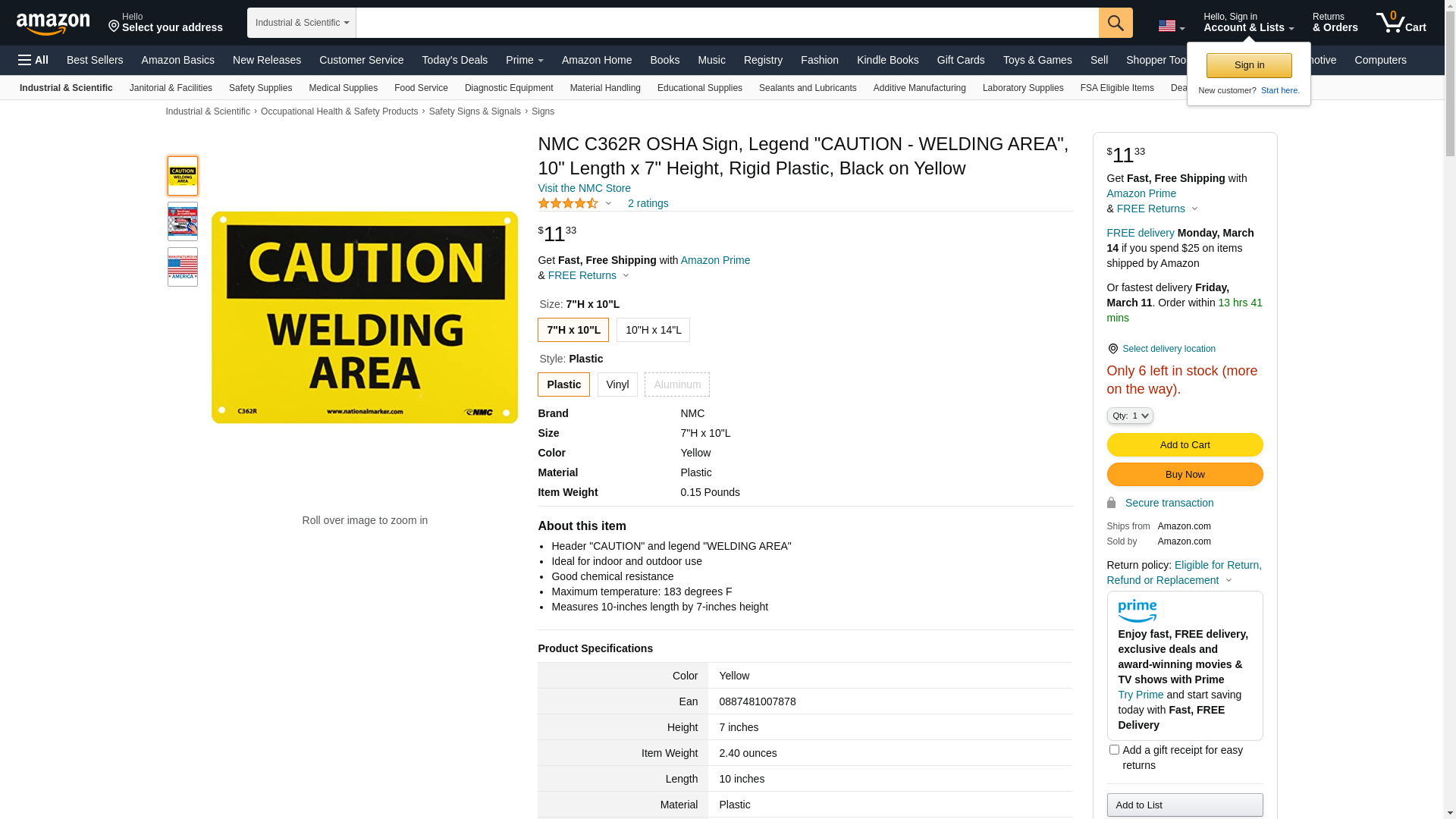 NMC C362R OSHA Sign, Legend "CAUTION - WELDING AREA", 10" Length x 7" Height, Rigid Plastic, Black on Yellow