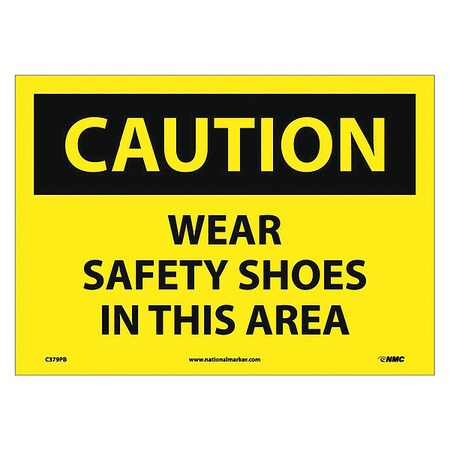 NMC C379PB OSHA Sign, Legend "CAUTION - WEAR SAFETY SHOES IN THIS AREA", 14" Length x 10" Height, Pressure Sensitive Adhesive Vinyl, Black on Yellow