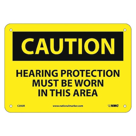 NMC C393R OSHA Sign, Legend "CAUTION - HEARING PROTECTION MUST BE WORN IN THIS AREA", 10" Length x 7" Height, Rigid Plastic, Black on Yellow
