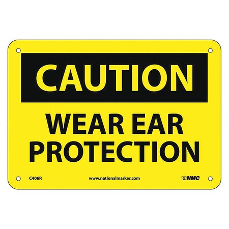 NMC C406R OSHA Sign, Legend "CAUTION - WEAR EAR PROTECTION", 10" Length x 7" Height, Rigid Plastic, Black on Yellow