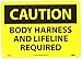 | Feature | Header "CAUTION" and legend "BODY HARNESS AND LIFELINE REQUIRED" |