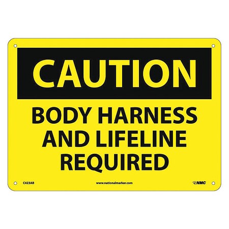 NMC C423AB OSHA Sign, Legend "CAUTION - BODY HARNESS AND LIFELINE REQUIRED", 14" Length x 10" Height, Aluminum, Black on Yellow