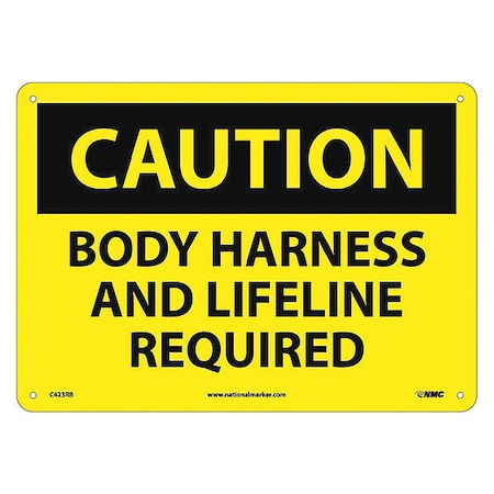 NMC C423RB OSHA Sign, Legend "CAUTION - BODY HARNESS AND LIFELINE REQUIRED", 14" Length x 10" Height, Rigid Plastic, Black on Yellow