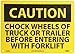 - Header "CAUTION" and legend "CHOCK WHEELS OF TRUCK OR TRAILER BEFORE ENTERING WITH FORKLIFT"