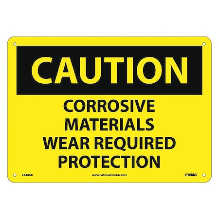 NMC C448AB OSHA Sign, Legend "CAUTION - CORROSIVE MATERIALS WEAR REQUIRED PROTECTION", 14" Length x 10" Height, Aluminum, Black on Yellow