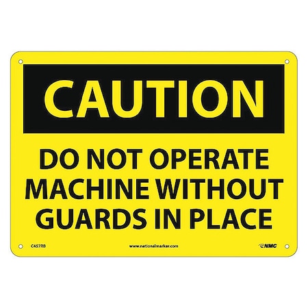 NMC C457RB OSHA Sign, Legend "CAUTION - DO NOT OPERATE MACHINE WITHOUT GUARDS IN PLACE", 14" Length x 10" Height, Rigid Plastic, Black on Yellow
