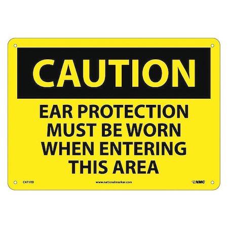 NMC C471RB OSHA Sign, Legend "CAUTION - EAR PROTECTION MUST BE WORN WHEN ENTERING THIS AREA", 14" Length x 10" Height, Rigid Plastic, Black on Yellow